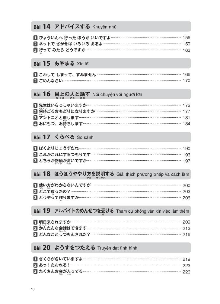 Giáo trình được biên soạn nhằm giúp người học giao tiếp bằng tiếng Nhật tốt hơn trong các hoạt động xã hội. Các tình huống học tập trong giáo trình là những tình huống thường được sử dụng để giao tiếp trên thực tế, được lựa chọn từ các lĩnh vực trong đời sống sinh hoạt, trường học và xã hội.
