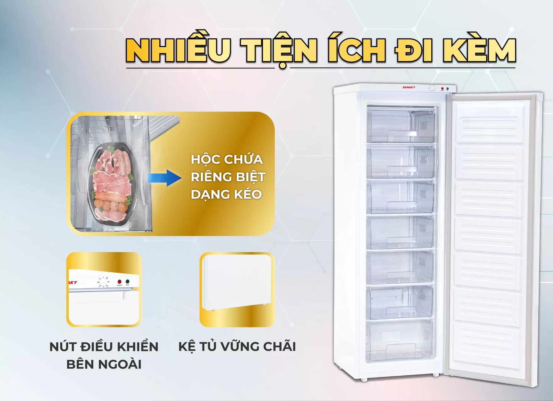 Tủ đông thiết kế với 7 hộc chứa dễ dàng cho việc vệ sinh và sắp xếp thực phẩm, dễ sử dụng, hạn chế thoát nhiệt, tiết kiệm điện năng. Đặc biệt hơn, với sản phẩm tủ đông này, các hộc chứa được thiết kế theo dạng ngăn kéo, rất tiện lợi với việc cất giữ thực phẩm.