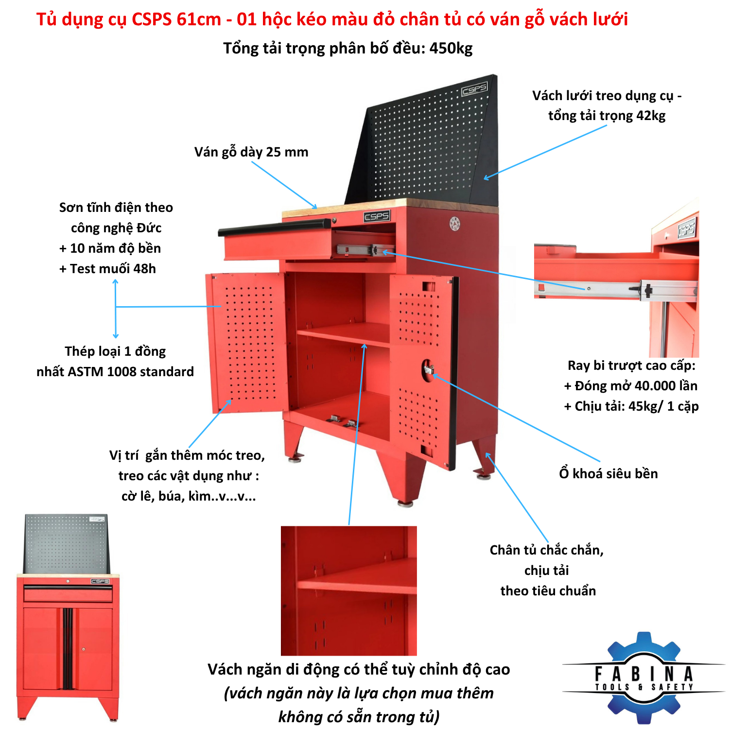Tủ dụng cụ CSPS 61cm - 01 hộc kéo màu đỏ ván gỗ vách lưới 1.THÔNG SỐ CHUNG Kích thước đóng gói/ Package dimension: 62cm W x 43cm D x 78.5cm H Kích thước sản