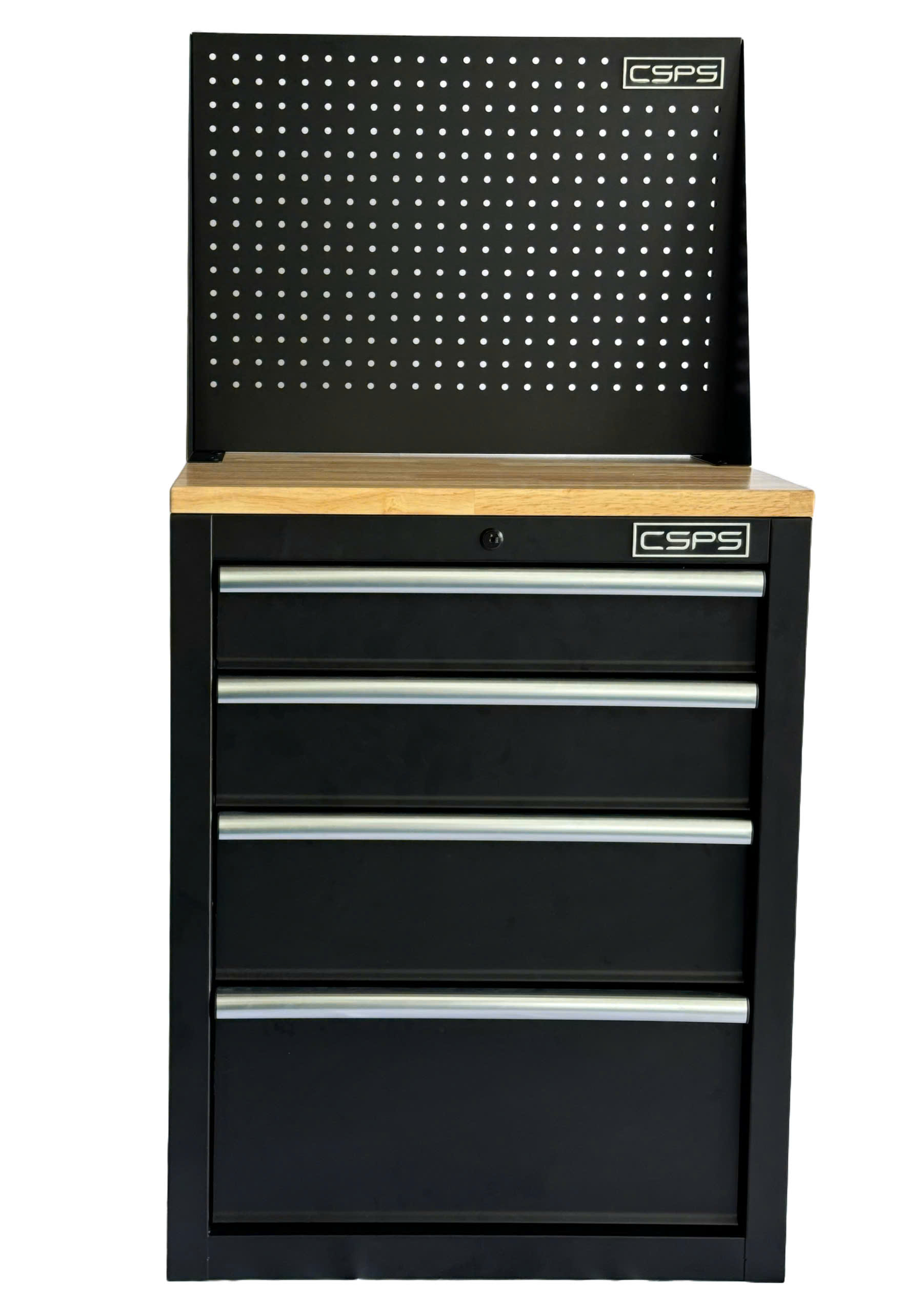 ✨Tủ dụng cụ CSPS 61cm - 04 hộc kéo màu đen ván gỗ vách lưới (tay cầm trắng)