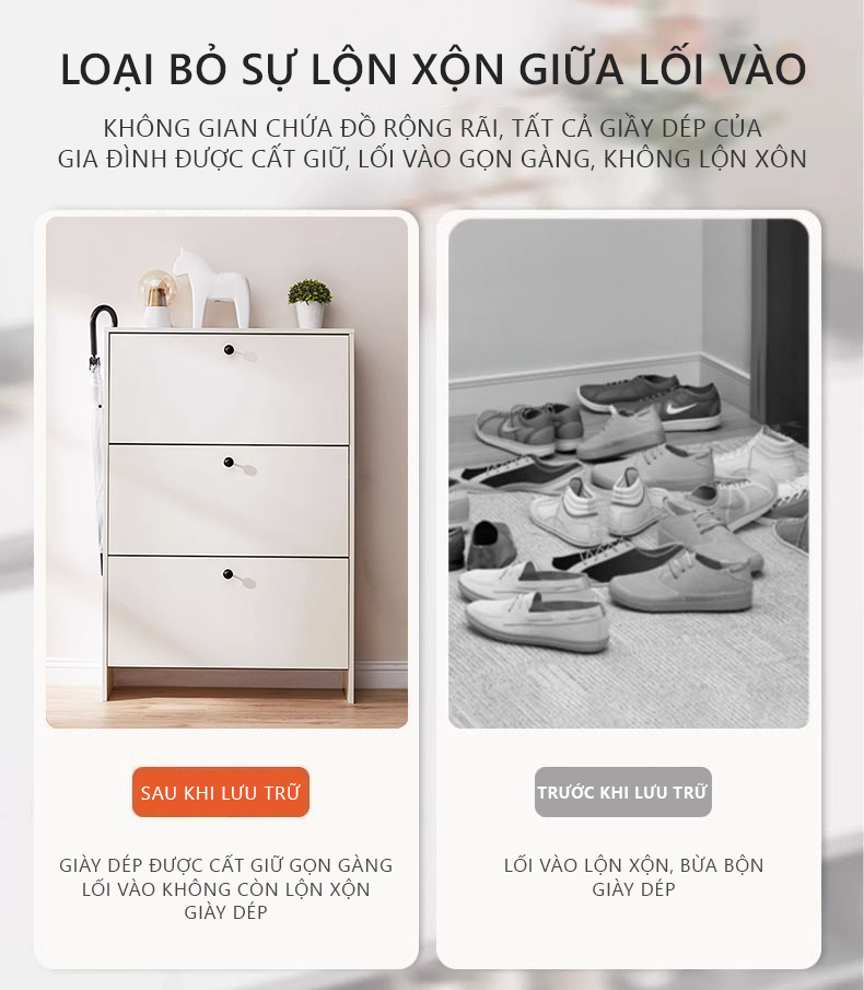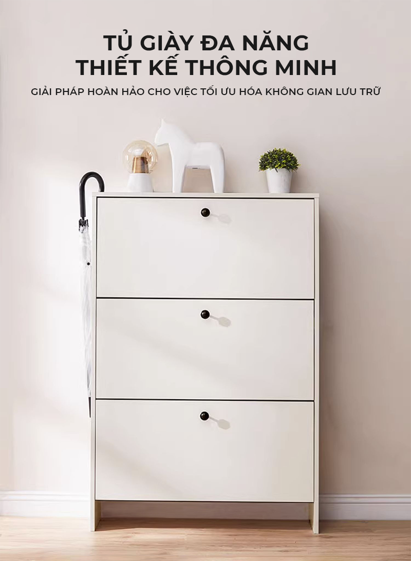 Công năng: Là mẫu tủ giày thông minh thiết kế 3 cánh lật lưu trữ 24 đôi giày dép, giúp bạn sắp xếp dày dép gọn gàng và ngăn nắp