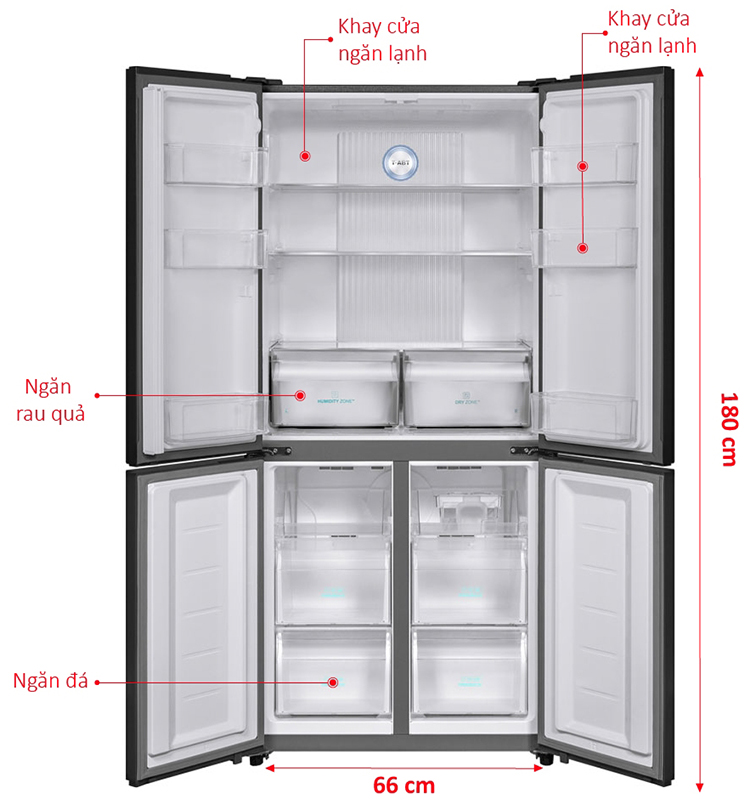 Với thiết kế tủ lạnh kiểu tủ 4 cửa có 1 ngăn lạnh trên, 2 ngăn đông dưới cùng dung tích sử dụng rộng rãi 456 lít phù hợp với gia đình có 4 - 5 thành viên, cho bạn sử dụng thuận tiện, dễ dàng.