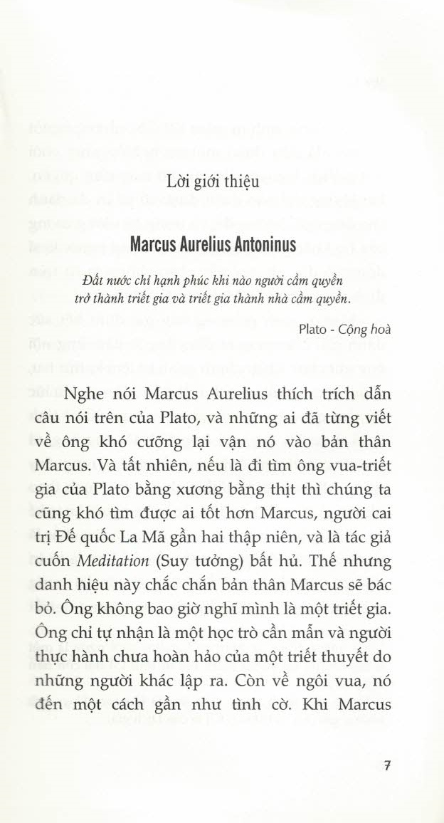 Nghe nói Marcus Aurelius thích trích dẫn câu nói trên của Plato, và những ai đã từng viết về ông khó cưỡng lại vận nó vào bản thân Marcus. Và tất nhiên, nếu là đi tìm ông vua-triết gia của Plato bằng xương bằng thịt thì chúng ta cũng khó tìm được ai tốt hơn Marcus, người cai trị Đế quốc La Mã gần hai thập niên, và là tác giả cuốn Meditation (Suy tưởng) bất hủ. Thế nhưng danh hiệu này chắc chắn bản thân Marcus sẽ bác bỏ. Ông không bao giờ nghĩ mình là một triết gia. Ông chỉ tự nhận là một học trò cần mẫn và người thực hành chưa hoàn hảo của một triết thuyết do những người khác lập ra. Còn về ngôi vua, nó đến một cách gần như tình cờ. Khi Marcus Annius Verus sinh ra, năm 121 CN, những người có mặt đã tiên đoán một sự nghiệp sáng chói trong Viện Nguyên lão của bộ máy cầm quyền. Họ không thể nào đoán được số phận đã dành cho ông ngôi hoàng đế, và trong trí tưởng tượng của họ không thể nào có cảnh tượng người kị sĩ đồng cô độc giơ tay vẫy chào chúng ta từ trên đỉnh đồi Capitol La Mã qua hai nghìn năm[1].