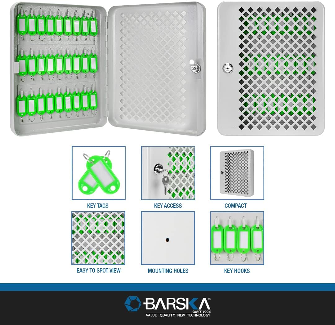 Tủ khóa mặt trước dạng lưới của Barska có tủ dạng móc giúp sắp xếp chìa khóa dễ dàng và tiện lợi. Bên trong tủ khóa này có ba hàng móc. Cửa dạng lưới cho phép nhận dạng ngay lập tức các móc rỗng. Các két an toàn có bốn lỗ lắp được khoan sẵn và phần cứng đi kèm để lắp đặt. Thành tủ và cửa được làm bằng thép đặc 0,8mm và được hoàn thiện bằng lớp phủ màu xám phẳng.