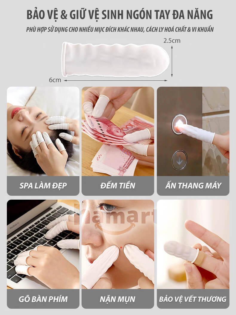 Mua tại TiktokBao ngón tay cao su là sản phẩm bảo hộ dùng trong y tế, công nghiệp, spa làm đẹp, làm móng nail, phun xăm thẩm mỹ có tác dụng bao bọc, bảo vệ đầu ngón tay người sử dụng, cách ly khỏi các yếu tố gây hại ngoài môi trường như vi khuẩn, bụi bẩn, hoá chất đồng thời ngăn chặn mồ hôi, bụi bẩn, dầu cơ thể từ bàn tay đến bề mặt mà nó tiếp xúc - Sản phẩm có kích thước phù hợp với đại đa số kích cỡ ngón tay của người Đông Nam Á.