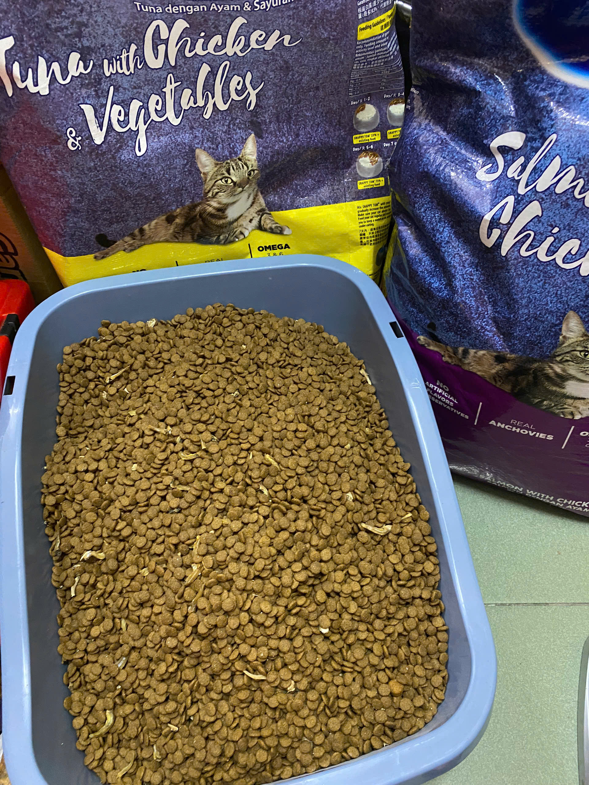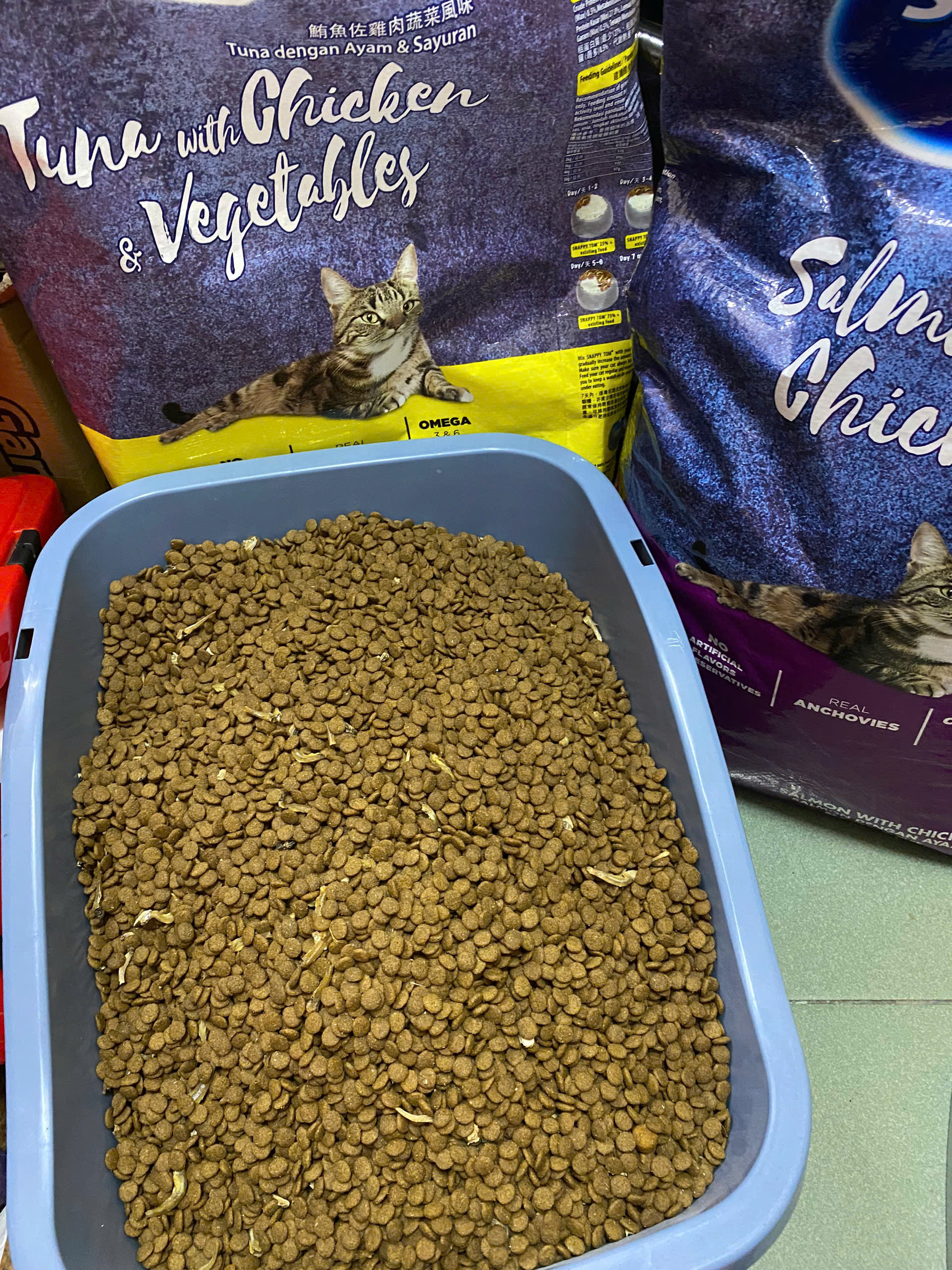 Hạt Snappy Tom cho Mèo có topping Thịt Cá Cơm thành phần từ Cá Hồi Thịt Gà Cá Biển và Rau củ
