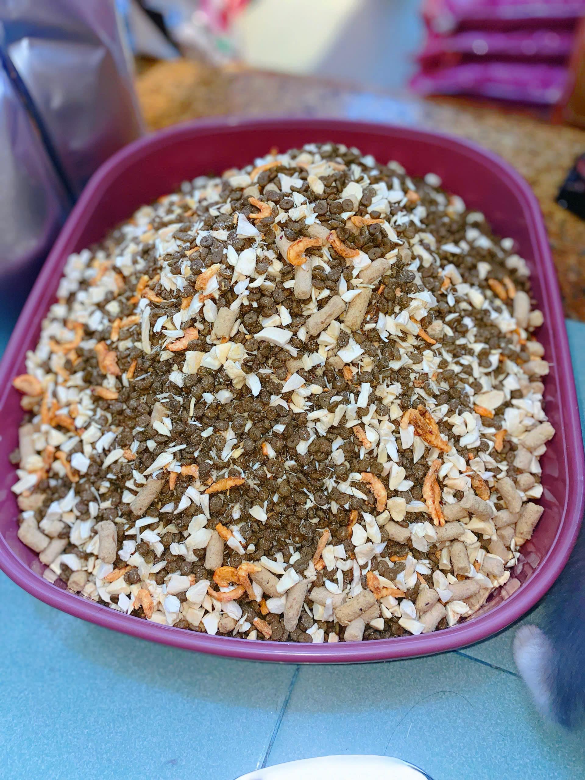 Choline Chloride, rau sấy, dầu cá ngừ, dầu cá hồi, Taurine, chiết xuất Yucca schidigera.