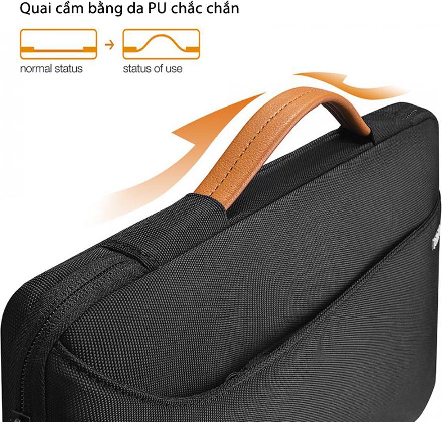 Với túi xách chống sốc MacBook Pro 13'' 2018 TOMTOC (USA) Spill-resistant chiếc túi chống sốc sẽ nhanh chóng biến thành một chiếc túi xách thời trang nhỏ gọn khi cách điệu thêm một quai cầm chắc chắn bằng da PU phía trên giúp tiện lợi hơn cho việc di chuyển.