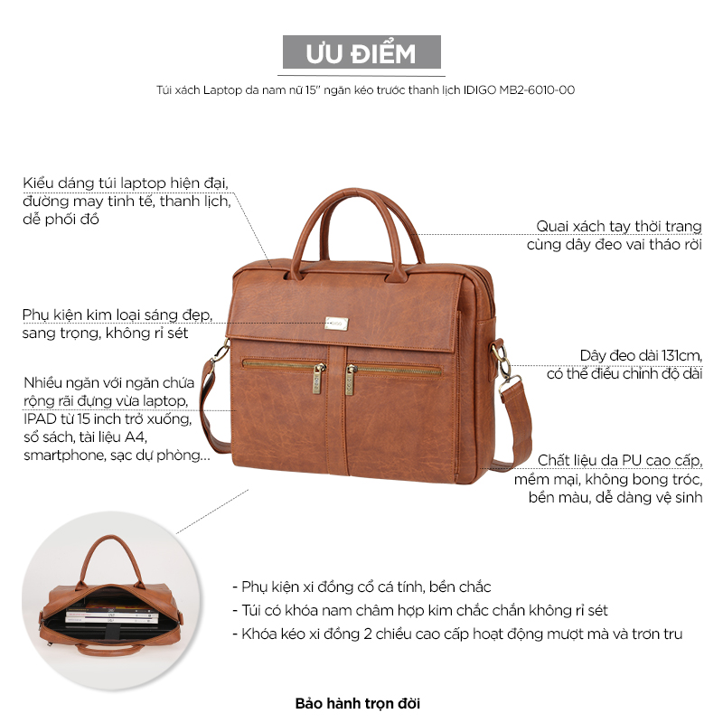 Túi xách Laptop da nam nữ 15" ngăn kéo trước thanh lịch IDIGO MB2-6010-00 sẽ giúp bạn: