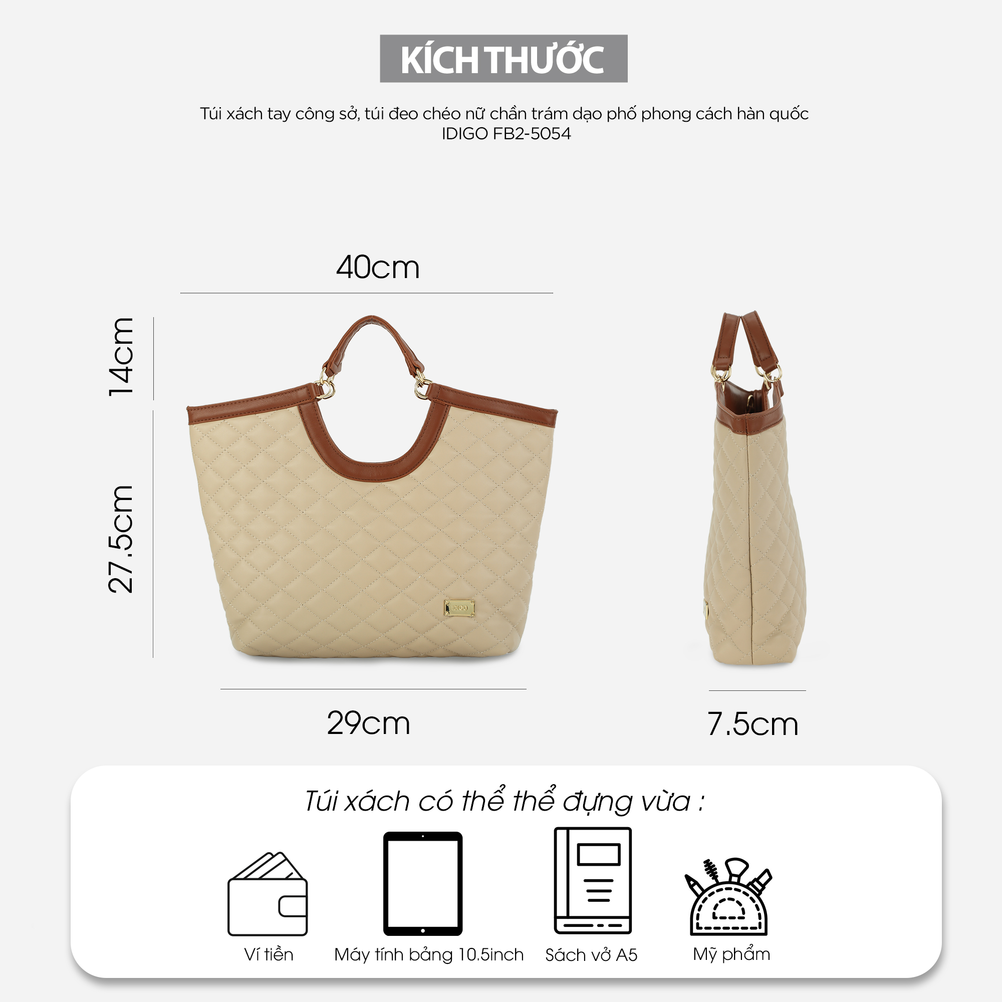 Chiếc Túi xách tay công sở, túi đeo chéo nữ chần trám dạo phố phong cách hàn quốc với thiết kế dáng hình thang cùng chi tiết chần trám lạ mắt tạo nên một phong cách vừa thanh lịch, lại rất hiện đại và tao nhã, ắt hẳn sẽ khiến cho các bạn siêu lòng ngay từ ánh nhìn đầu tiên.       Túi xách tay công sở, túi đeo chéo nữ chần trám dạo phố phong cách hàn quốc này thích hợp cho cho các bạn mang đi làm, đi chơi, du lịch hay dạo phố, cà phê cùng bạn bè...     - Kích thước: 29 x 7.5 x 27.5 x 40cm (Dài đáy x Rộng x Cao x Dài miệng) - Kích thước chiều cao có thể kéo khoá: 18cm - Màu sắc: Đen, Be, Kem, Nâu đậm - Chất liệu: Da tổng hợp - Trọng lượng: 460 gram - Xuất xứ: Trung Quốc - Số ngăn: 1 chính, 1 phụ nhỏ bên trong, 1 kéo nhỏ bên trong - Chiều cao quai xách tay: 14cm - Chiều dài dây đeo chéo: 110cm (có khoá thâu tăng giảm độ dài) - Cách đeo: (1) đeo chéo (2) đeo vai (3) xách tay Gam màu thanh lịch, bền màu với thời gian, đường may chắc chắn. Chất liệu da tổng hợp có độ mềm vừa đủ tạo nên phom dáng túi, vừa có độ đàn hồi, vừa chống thấm nước nhẹ, bền đẹp và dễ dàng vệ sinh.       Phom túi hình thang với chất liệu da có độ mềm vừa phải giúp túi hạn chế bị cong vênh, nhăn gãy khi sử dụng.     Bên trong túi có 1 ngăn chính thích hợp đựng máy tính bảng từ 10.5inch trở xuống, điện thoại, ví tiền (Có thể để tài liệu A4 trong trường hợp không kéo khoá)… Ngoài ra bên trong túi còn có 1 ngăn phụ nhỏ đựng các loại giấy tờ tuỳ thân, thẻ xe cùng 1 ngăn kéo nhỏ để được chìa khoá, mỹ phẩm… rất thích hợp sử dụng để đi làm, đi chơi, du lịch hay dạo phố.       Túi có khóa kéo cao cấp hoạt động mượt mà và trơn tru, dây kéo bền & chắc chắn. Đặc biệt, luân phiên xách tay với quai xách cố định cao 14cm hoặc đeo chéo/đeo vai với dây da dài 110cm giúp thay đổi phong cách.       Sản phẩm túi xách này được IDIGO đặt sản xuất tại nhà máy Trung Quốc và nhập khẩu chính ngạch về Việt Nam, có thông tin sản phẩm nhập khẩu in rõ ràng trên tem nhãn.