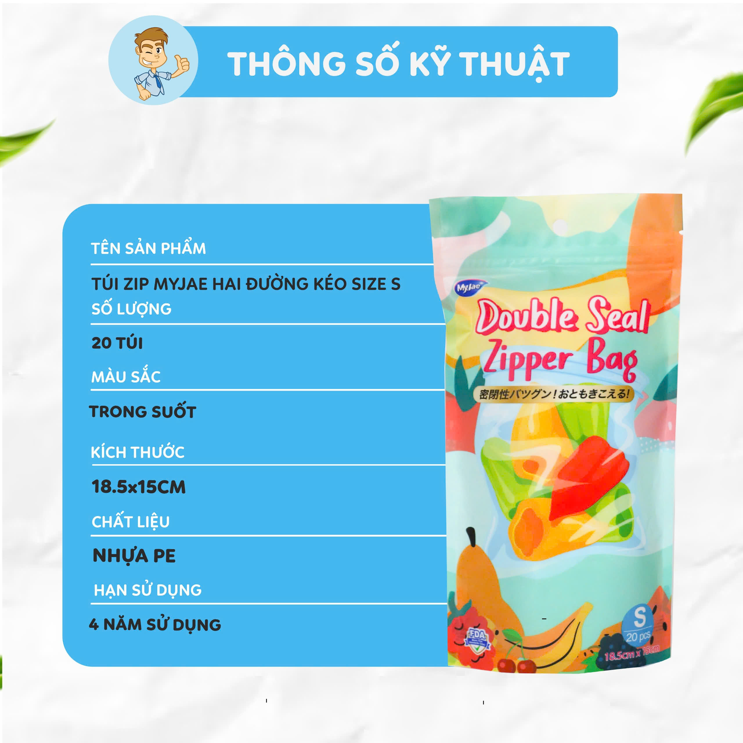 *Thông số kỹ thuật: Thương hiệu : MyJae Tên sản phẩm : Túi zip 2 đường kéo Màu sắc : Trong suốt Chất liệu : PE Kích thước: Size S: 18,5cm *15cm (42 cái) Size