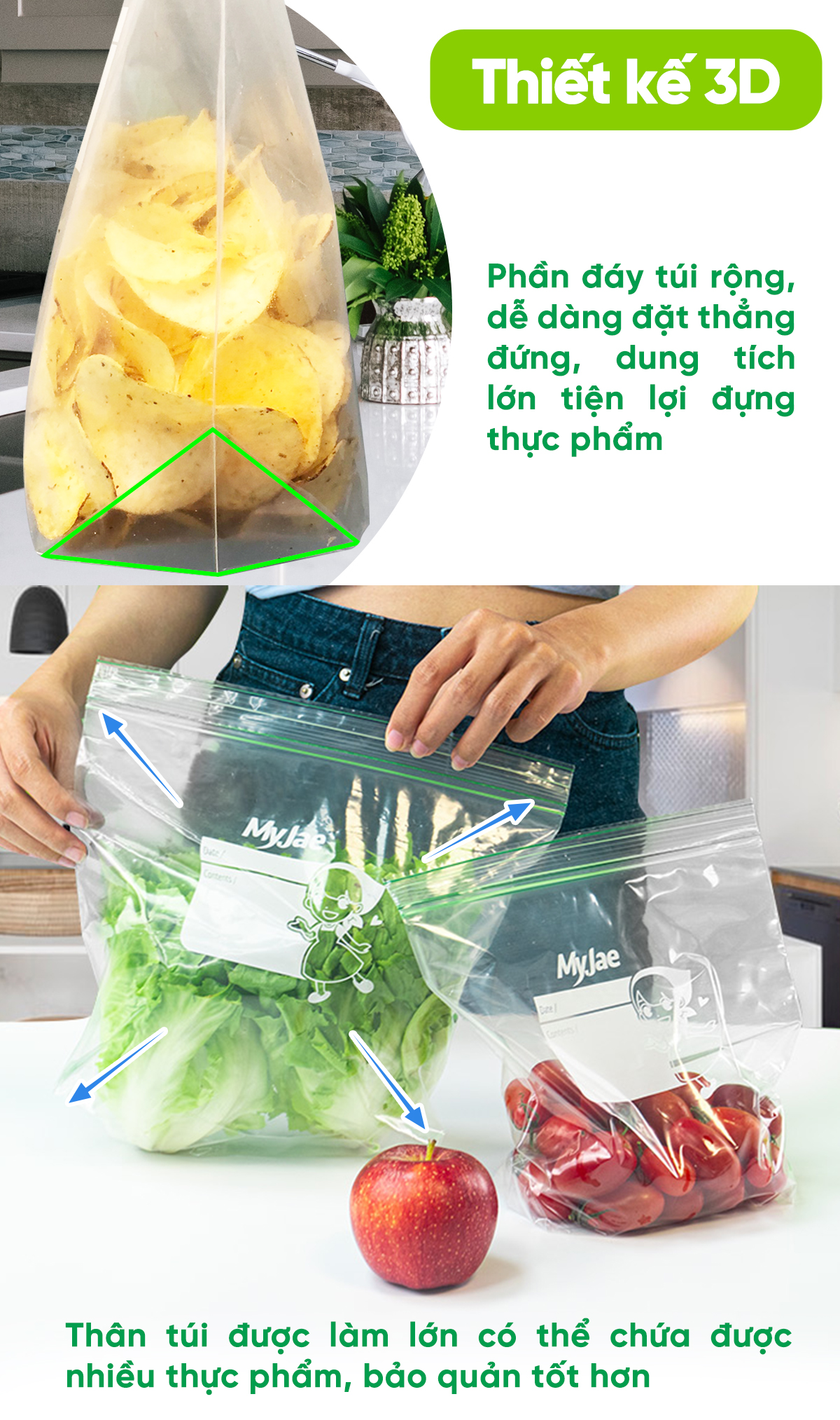 - Thương hiệu: MyJae  - Tên sản phẩm: Túi zip hai đường kéo MyJae size XL - Chất liệu: PE - Kích thước: 27cm x 23cm - Số lượng: 15 cái - 100% CÓ THỂ PHÂN HỦY NHỜ VIỆC SỬ DỤNG CÁC CHẤT PHỤ GIA PHÂN HỦY SINH HỌC GIÚP THÂN THIỆN HƠN VỚI MÔI TRƯỜNG, GIẢM LƯỢNG KHÍ THẢI CARBON VÀ Ô NHIỂM MÔI TRƯỜNG - Chất liệu 100% PE an toàn thực phẩm, đạt tiêu chuẩn FDA của Mỹ, không chất hóa dẻo, không độc hại - Mức độ niêm phong tốt hơn, có thể chặn không khí xâm nhập vào thực phẩm một cách hiệu quả và cải thiện hiệu quả bảo quản. - Chống rò rỉ nước, bọc kín: Chất lỏng được niêm phong kỹ càng không chảy ra ngoài - Phần đáy túi rộng, dễ dàng đặt thẳng đứng, dung tích lớn tiện lợi đựng thực phẩm - Có thể chứa được nhiều thực phẩm, bảo quản tốt hơn - Thân túi có chỗ ghi note, dùng khi nào ghi khi đó, chỉ cần nhìn sơ đã có thể nắm được hạn sử dụng của sản phẩm - Thách thức mọi không gian, ngăn đông, ngăn mát