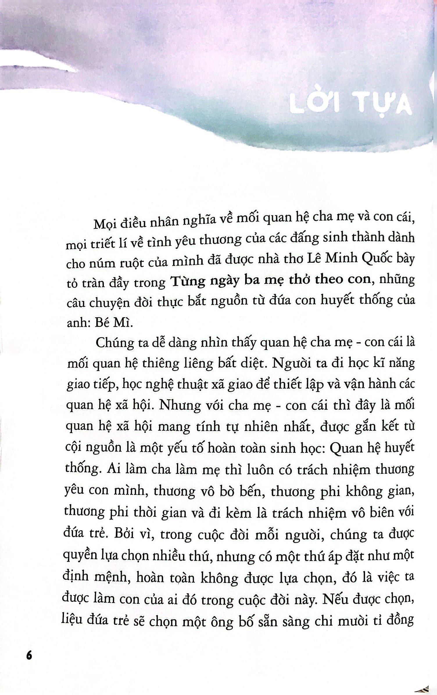 Chúng ta được quyền lựa chọn nhiều thứ, nhưng có một thứ như một định mệnh, đó là việc ta được làm cha mẹ hay làm con của ai đó trong cuộc đời này. Chính vì thế, tập tùy bút Từng ngày ba mẹ thở theo con là quyển sách dành cho tất cả. Đọc để cười vui cùng tác giả khi được làm cha của cô con gái nhỏ. Đọc để rưng rưng hồi nhớ bao điều đẹp đẽ cha mẹ đã dành cho mình.