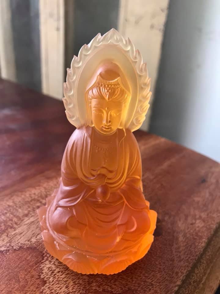 TƯỢNG PHẬT BÀ QUAN ÂM 2 MẶT ĐÁ LƯU LY VÀNG ĐẬM ĐỂ TRONG XE HƠI 10cmx6cm - HÀNG PHONG THUỶ SUNNY Q8