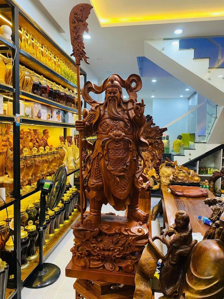Tượng quan công cầm đao đứng trên đầu hổ phù được làm bằng chất liệu gỗ hương đá tự nhiên 100% Kích thước cao 80ngang31 sâu 21cm _ Tượng quan công cầm đao được trạm khắc tỉ mỉ tinh sảo kỳ công .Đi hầu hết mọi chi tiết góc ngách nội dung hoa văn của quân công đều được chỉnh sửa ngọt tỉa hoàn toàn bằng tay thủ công .Đồng thời tượng quan công được kiểm định rất kỹ lưỡng như cho vào thẩm sấy cho gỗ khô kiệt .Mục đich trống dập nứt vênh mo mối mọt .Kết hợp với trà nhám đánh giấy giáp nhiều lần cho sạch sẽ ,Sờ mát lạnh song cho vào phun lót làm bóng mờ để giữ lại mầu sắc vân gỗ tự nhiên .Tượng quan công được làm và hoàn thiện do bàn tay khối óc tài hoa .Từ những người thợ giàu kinh nghiệm cũng như tay nghề cao trong làng nghề truyền thống .Chính vì thế tượng quan công đã đáp ứng đầy đủ những tiêu trí ( Đẹp bền rẻ ) Thẩm mỹ nghệ thuật với chất lượng tuyệt vời