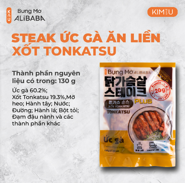 Thành phần: Ức gà 60.2%; Xốt Tonkatsu 19.3%,Mỡ heo; Hành tây; Nước; Đường; Hành lá; Bột tỏi; Đạm đậu nành và các thành phần khác