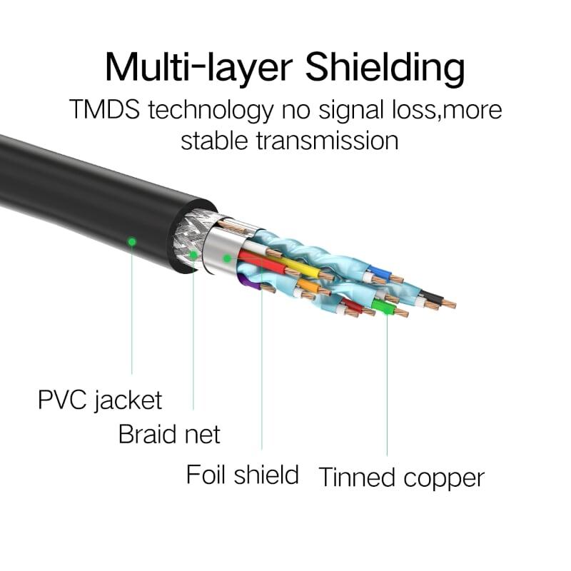 1. 1-2M: 30AWG;3M: 28AWG 2. Wire Core: tin-plated oxygen-free copper 3. Support 3D/HDR/HDCP 4. Resolution: 1080P@240Hz/2K@165Hz/4K-144Hz/8K@60Hz 5. Multiple internal shielding 6. Support mirror mode and extend mode 7. Support ATI eyefinity multi split-screen mode 8.