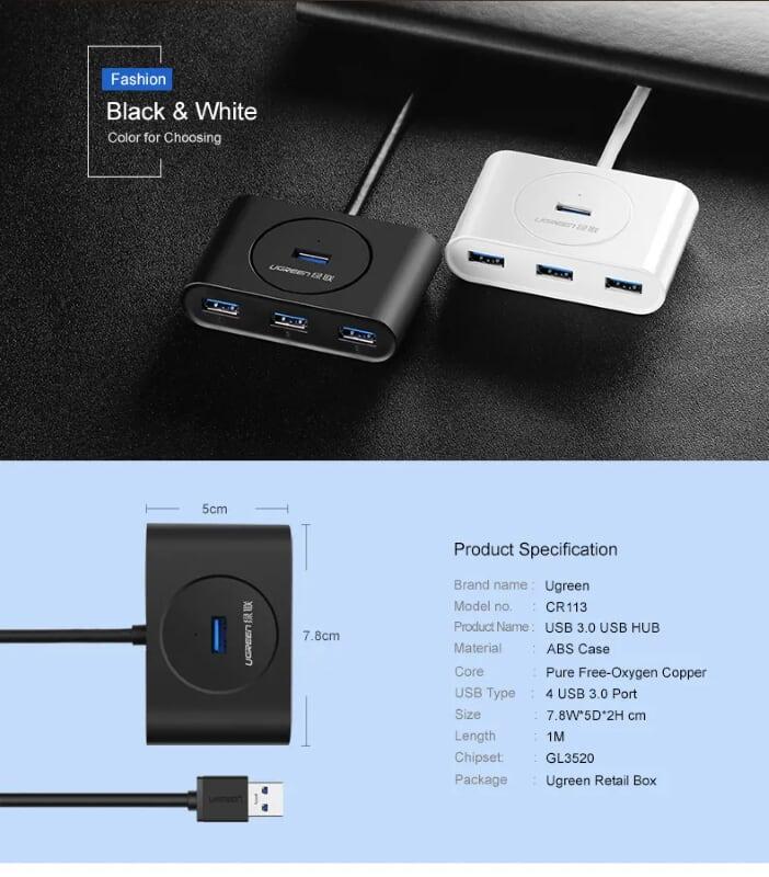Ugreen 20283 0.8m usb 3.0 hub with powwer port màu trắng 80cm cr113 1. Input: USB-A 2. Output : 4 Port USB 3.0 . có cổng micro nguồn 5V 3. Color : White 4. Length : 1m