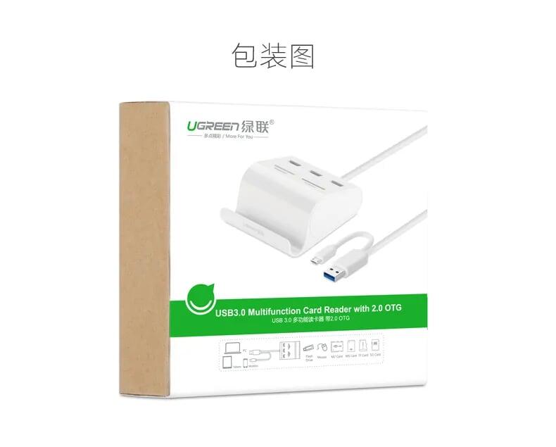 Ugreen 30344 1m màu trắng usb 3.0 3 ports hub + card reader with cradle us156 1. Support TF/SD/MS/CF card 2. Color : White 3. Length: 1m 4. 250g 5. 20 x 20 x 5