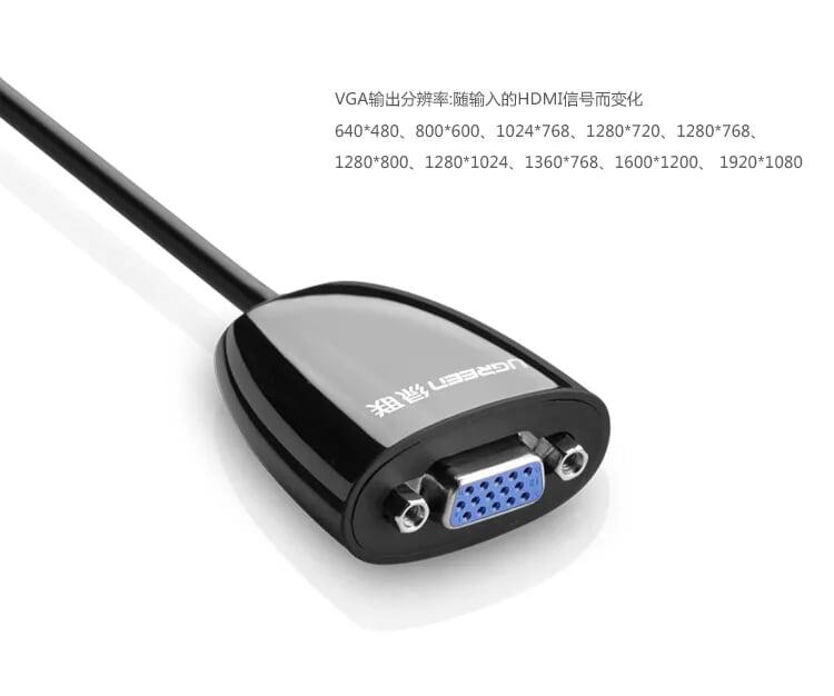 Ugreen 40248 Hdmi To Vga + 3.5Mm Audio + Mirco Usb Converter Flat Design Đen Mm103 1. Features: connect HDMI port device to monitor, projector with VGA port. 2. Cable length: 15CM 3. Wire form: