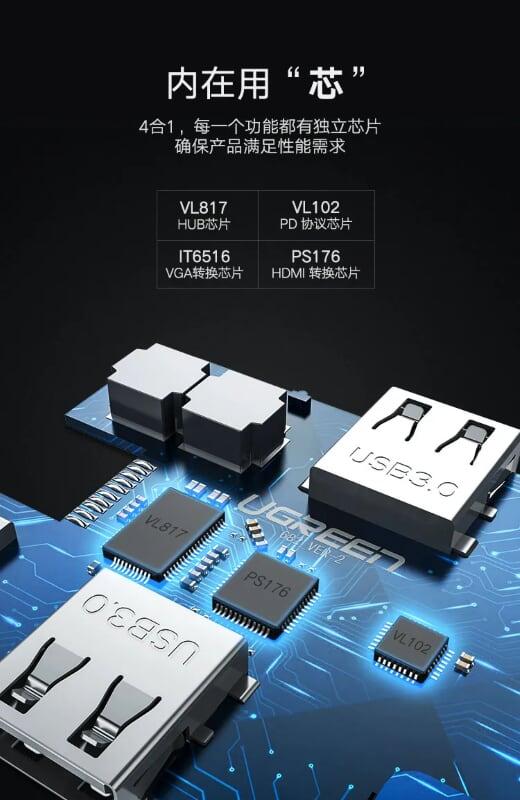 ✨Ugreen UG50319CM163TK Bộ chuyển đổi TYPE C sang 3 USB 3.0 + HDMI + VGA + hỗ trợ nguồn TYPE C - HÀNG CHÍNH HÃNG