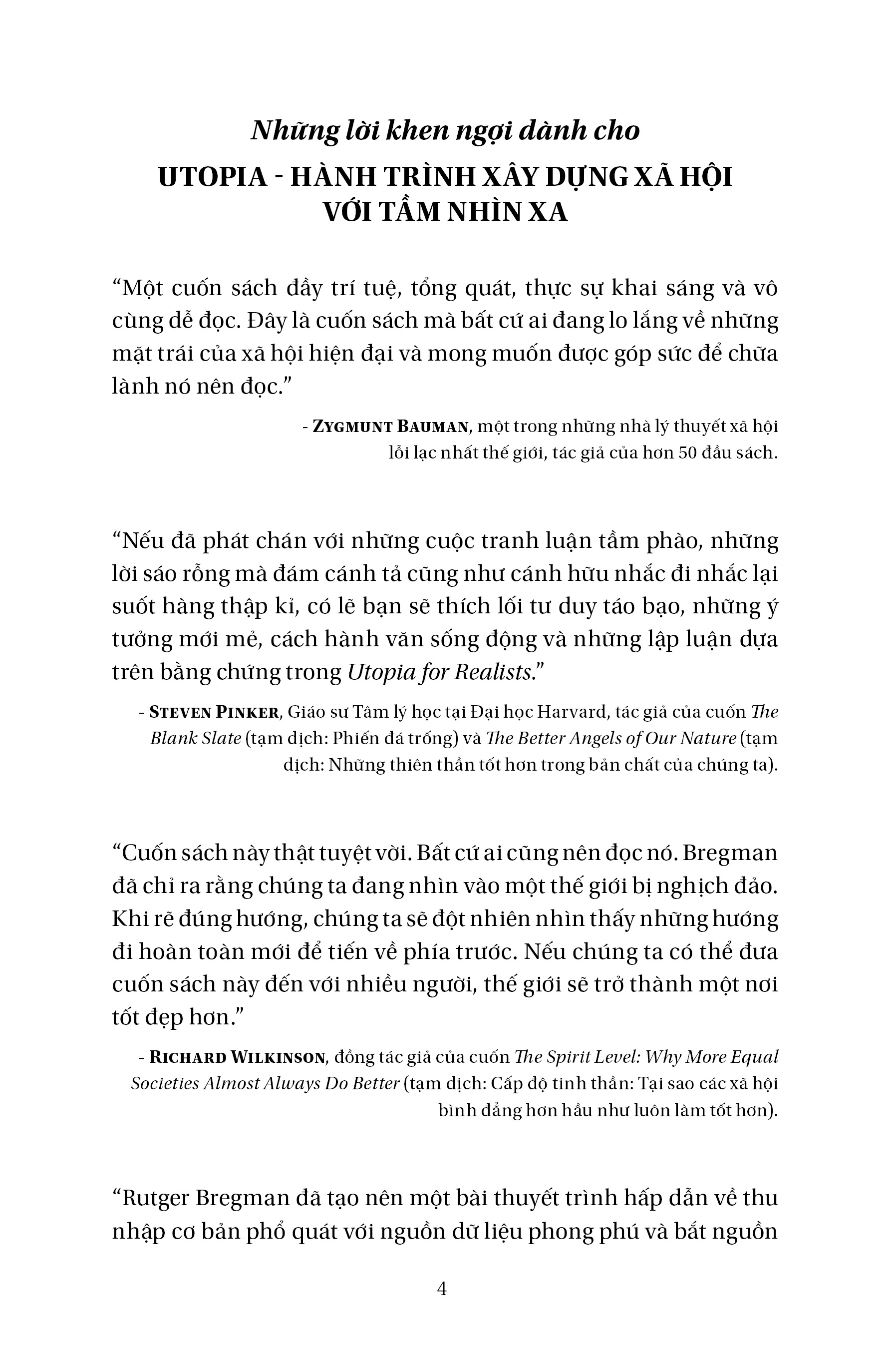 Rutger Bregman là nhà tư tưởng thế hệ mới, quan điểm lí luận của anh đã phá vỡ hệ tư tưởng nặng nề tồn tại suốt 40 năm qua, đồng thời cũng phá vỡ quỹ đạo cuộc sống xã hội ngột ngạt hiện tại. Những quan điểm lí luận đó được thể hiện rõ nét trong Utopia – Hành trình xây dựng xã hội với tầm nhìn xa.