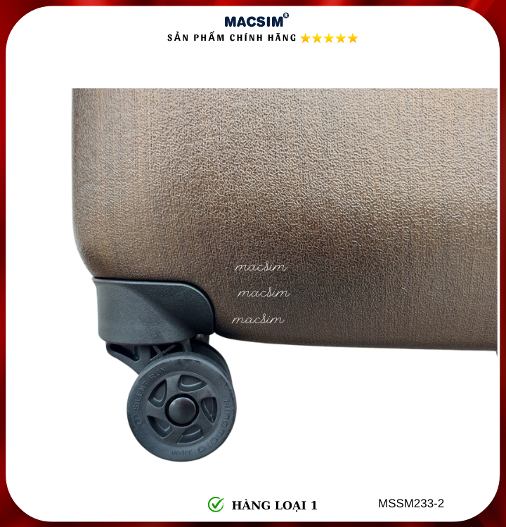 Vali Macsim được làm từ chất liệu nhựa nguyên chất PC. Tấm lót bên trong Poliester 150D xuất xứ Trung Quốc được REACH kiểm nghiệm và phê duyệt, bánh xe 360 độ hãng Hinomoto của Nhật ; Khóa kéo thương hiệu SBS xuất xứ Trung Quốc, Khóa TSA hãng Master Lock của Mỹ. Thiết kế vali đơn giản lịch lãm vô cùng sang trọng, bền bỉ, tạo dấu ấn phong cách thời trang cá nhân của bạn trên mọi cuộc hành trình. Vali cao cấp Macssim thích hợp với những người thường xuyên di chuyển cần chiếc vali nhẹ, có độ bền tốt.