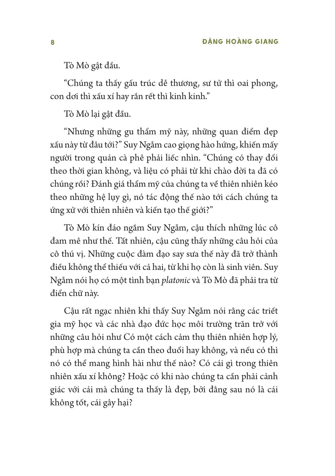 Cuốn sách chứa đựng nhiều quan điểm triết học, khối lượng thông tin tương đối phong phú liên quan đến quan điểm mỹ học, thế giới sinh vật… nhưng được truyền tải một cách khéo léo, dễ tiếp cận qua những cuộc đối thoại, trò chuyện đời thường giữa cặp đôi nhân vật Tò Mò & Suy Ngẫm, giúp khơi gợi ở bạn đọc cách cảm nhận đúng về vẻ đẹp của thiên nhiên: Thiên nhiên đẹp như nó vốn có, không phụ thuộc vào các quy chuẩn đẹp mà chúng ta áp cho con người và khi đã yêu thiên nhiên, một cách tự nhiên, chúng ta sẽ biết cách bảo vệ thiên nhiên.