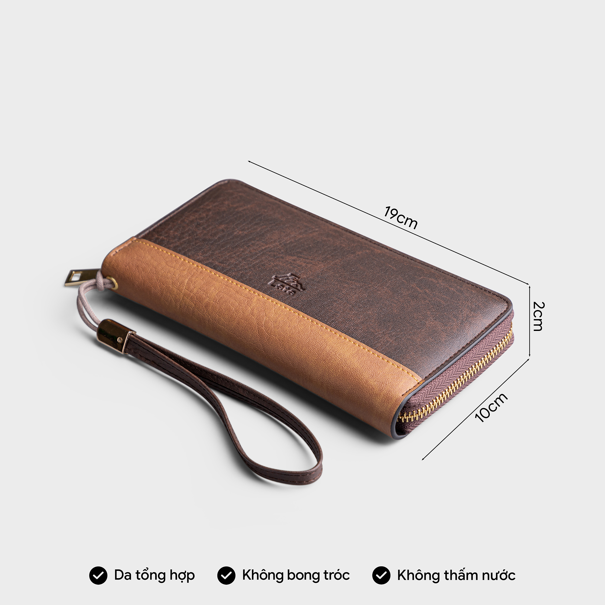 Kích thước: Chiều cao 13.0cm x Chiều ngang 21.0cm x Chiều rộng 4.0cm Ví cầm tay có dây đeo tay tháo rời được Có hai vách ngăn đựng thẻ và điện thoại Dây khóa kéo