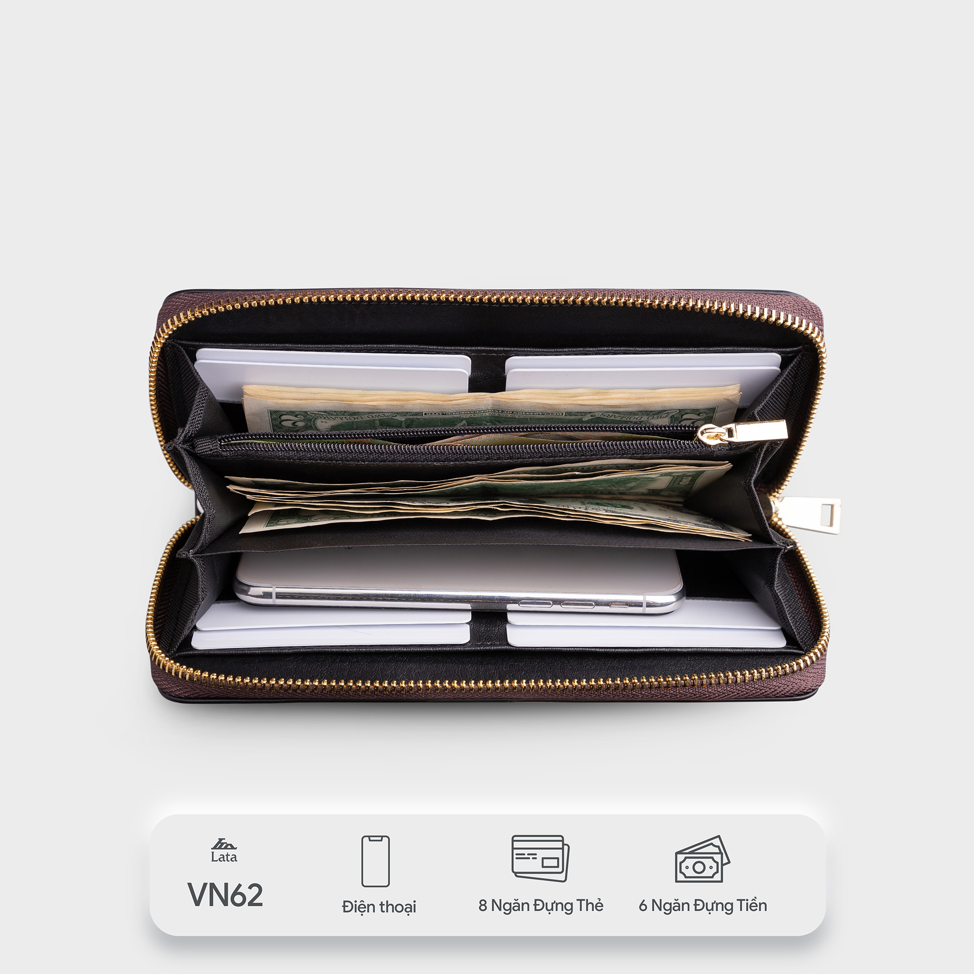 Ví da nữ cầm tay phối màu Lata VN62 là mẫu ví dành cho phái nữ đến từ nhà Lata. Sở hữu kiểu dáng hiện đại, chiếc ví hiện được rất ưa chuộng. Sản phẩm có thiết kế ngăn linh hoạt, khoa học và hợp lý để chứa những vật dụng cá nhân thiết yếu như: thẻ, giấy tờ, khi đi ra ngoài. Ví sẽ là món phụ kiện góp phần tạo nên phong cách thời trang cho riêng bạn.