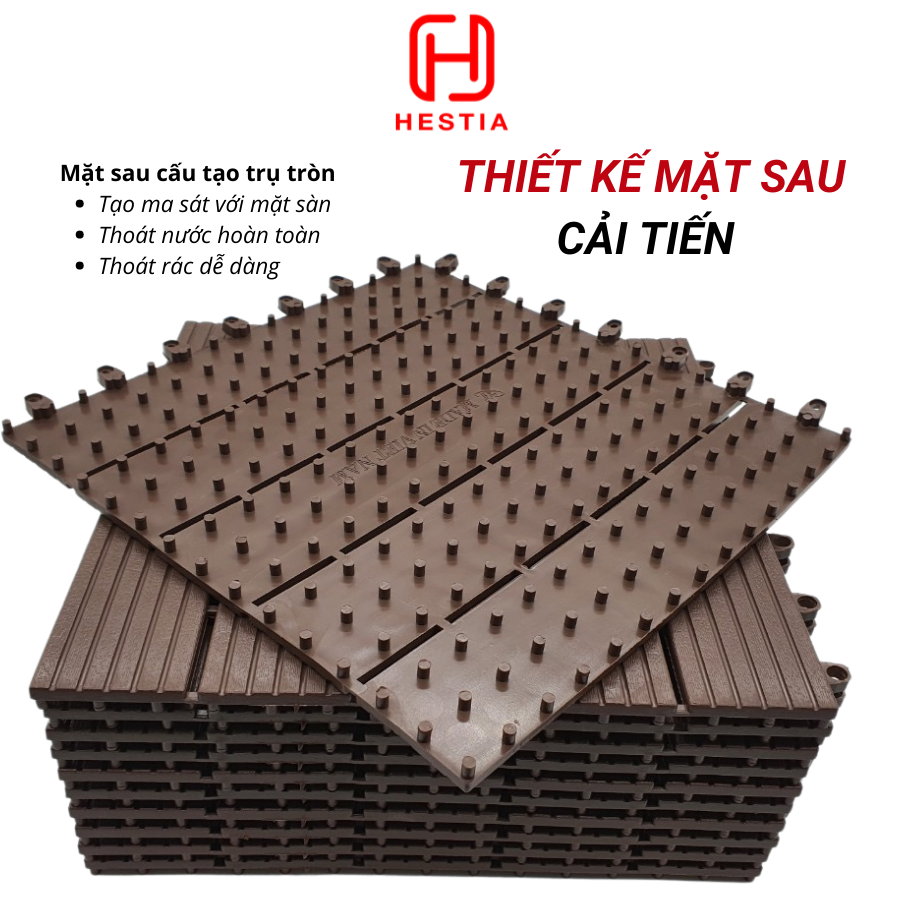 Dễ dàng lắp ráp, mix các màu: Hệ chân tròn mặt sau của sản phẩm vừa tạo ma sát, vừa dễ thoát nước & thoát rác nhưng nó cũng là chốt để sập lên tai của tấm kế bên để giữ nhau, việc thi công trở nên dễ dàng vô cùng.
