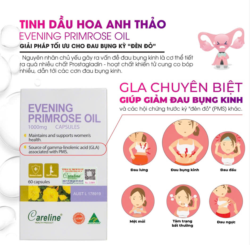 - Careline Evening Primrose Oil 1000Mg là sản phẩm tinh dầu hoa anh thảo sử dụng phương pháp ép lạnh tiên tiến, đáp ứng đầy đủ các tiêu chuẩn khắt khe từ Cơ quan Quản lý Dược phẩm Úc