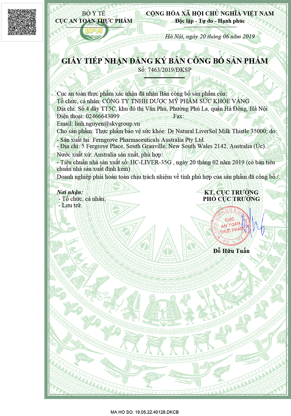 - Người men gan cao LIỀU DÙNG: 1 viên/ngày. Uống khi no hoặc theo hướng dẫn của chuyên gia y tế QUY CÁCH ĐÓNG GÓI: 60 viên/lọ/hộp Số ĐKSP (BỘ Y TẾ): 7463/2019/ĐKSP GIẤY PHÉP LƯU HÀNH TẠI ÚC: AUSTL 223089 Lưu ý: Thực phẩm này không phải là thuốc và không có tác dụng thay thế thuốc. Cảnh báo: Không dùng cho người mẫn cảm với bất kỳ thành phần nào của sản phẩm. Không sử dụng nếu tem bị mất, rách hoặc hư hỏng Bảo quản: ở nhiệt độ dưới 25 độ C. Hạn sử dụng: 3 năm kể từ ngày sản xuất. Hạn sử dụng xem trên bao bì. Xuất xứ: Australia Thương nhân nhập khẩu, phân phối và chịu trách nhiệm về chất lượng hàng hóa: CÔNG TY TNHH DƯỢC MỸ PHẨM SỨC KHỎE VÀNG TÀI LIỆU NGHIÊN CỨU KHOA HỌC () Gan là cơ quan quan trọng đảm nhiệm nhiều chức năng quan trọng và phức tạp. Một chức năng quan trọng của gan là giải độc. Từ lâu, một dược thảo đã được sử dụng từ phương Tây để bảo vệ gan và hỗ trợ chức năng gan. Đó là cây Kế sữa (Milk Thistle) có tên khoa học gọi là Silybum marianum thuộc họ Compositae. Hoạt chất có trong dược thảo có tác dụng bảo vệ gan được xác định là Silymarin. Silymarin là hợp chất thuộc loại flavonoid được chiết từ hạt hoặc từ quả cây Kế sữa. Cho tới nay, đã có nhiều công trình nghiên cứu chứng minh Silymarin giúp bảo vệ gan và hỗ trợ chức năng gan trong việc làm giảm viêm gan là do có 4 tác dụng đã được chứng minh sau đây().