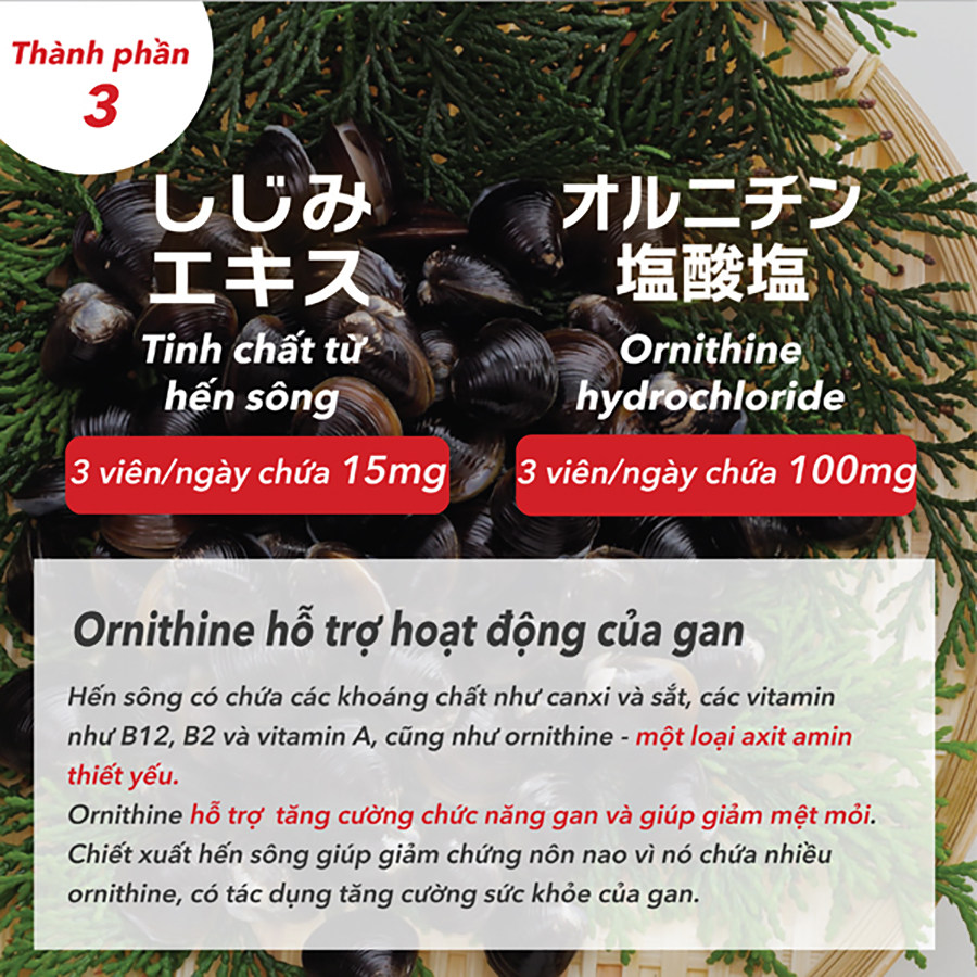 Dầu hoa rum, Gan lợn thủy phân, Ornithine, Men cái, Chiết xuất củ nghệ, Bột nghệ vàng, Chiết xuất hến sông, Bột mầm cây súp lơ xanh, gelatin, glycerin, sáp ong, este của glycerin và axit béo, lecithin.