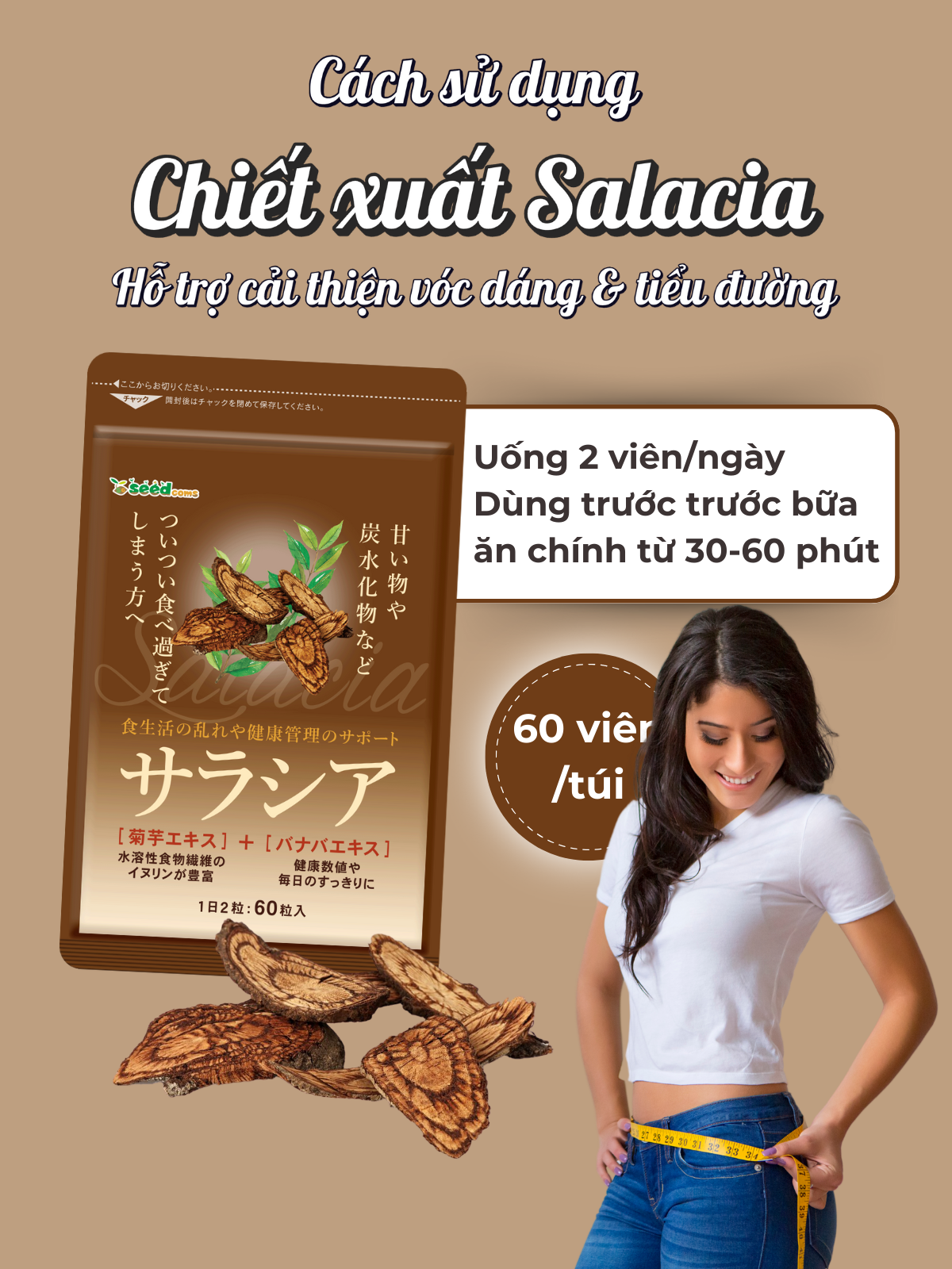 Mua tại TiktokTHÀNH PHẦN CỦA VIÊN UỐNG CHIẾT XUẤT SALACIA: Bột cây keo Ấn Độ Salacia (sản xuất trong nước), si rô tinh bột maltose, bột tinh chất atiso Jerusalem, bột tinh chất bằng lăng nước/cellulose tinh thể, canxi stearate, silic dioxit hạt mịn, pullulan CÔNG DỤNG CỦA VIÊN UỐNG CHIẾT XUẤT SALACIA: