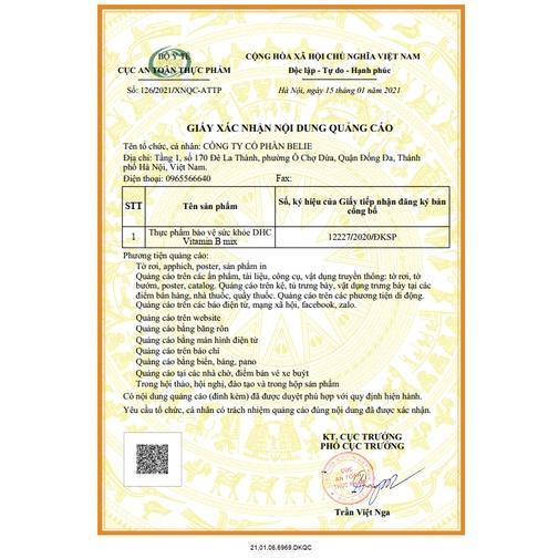 Thực phẩm này không phải là thuốc, không có tác dụng thay thế thuốc chữa bệnh Quy cách: túi 30 ngày (60 viên) Khối lượng viên: 200 ± 15mg Xuất xứ: hãng DHC Nhật Bản