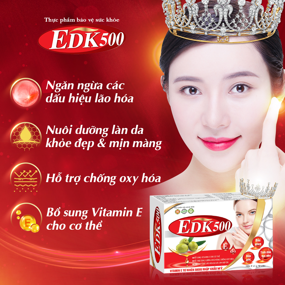 Viên Uống Bổ Sung Vitamin E EDK500 - Giúp Tăng Cường Chống Oxy Hóa, Trẻ Hóa Và Làm Đẹp Da *Bao bì sản phẩm có thể thay đổi theo từng đợt nhập hàng • BỔ SUNG VITAMIN E CHO CƠ THỂ • HỖ TRỢ TĂNG CƯỜNG KHẢ NĂNG CHỐNG OXY HÓA • GIÚP HẠN CHẾ LÃO HÓA DA VÀ LÀM ĐẸP DA THÀNH PHẦN: • Vitamin E tự nhiên 500IU (Natural source D-alpha-tocopheryl acetate oil) • Dầu Olive 50mg • Dầu Gấc 30mg • Tinh dầu Hạt Nho 20mg • Phụ liệu: Gelatin, Glycerin, Sorbitol, Nipazin, Ethyl vanilin, nước tinh khiết vừa đủ 1 viên. • Khối lượng trung bình viên: 1300mg ± 7,5%.   CÔNG DỤNG: Bổ sung Vitamin E cho cơ thể, hỗ trợ tăng cường chống oxy hóa, giúp hạn chế lão hóa da và làm đẹp da. ĐỐI TƯỢNG SỬ DỤNG: • Người bị lão hóa da, khô da, sạm da, người có nhu cầu làm đẹp da. Người thường xuyên tiếp xúc với ánh nắng mặt trời có hại cho da. • Người thiếu hụt Vitamin E CÁCH DÙNG: • Uống sau khi ăn • Uống 1 viên/lần x 1-2 lần/ngày. Nên dùng thường xuyên để có kết quả tốt.   BẢO QUẢN: Nơi khô ráo, tránh ánh nắng mặt trời. Để xa tầm tay trẻ em. Lưu ý: Không sử dụng cho người mẩn cảm với bất kỳ thành phần nào của sản phẩm.