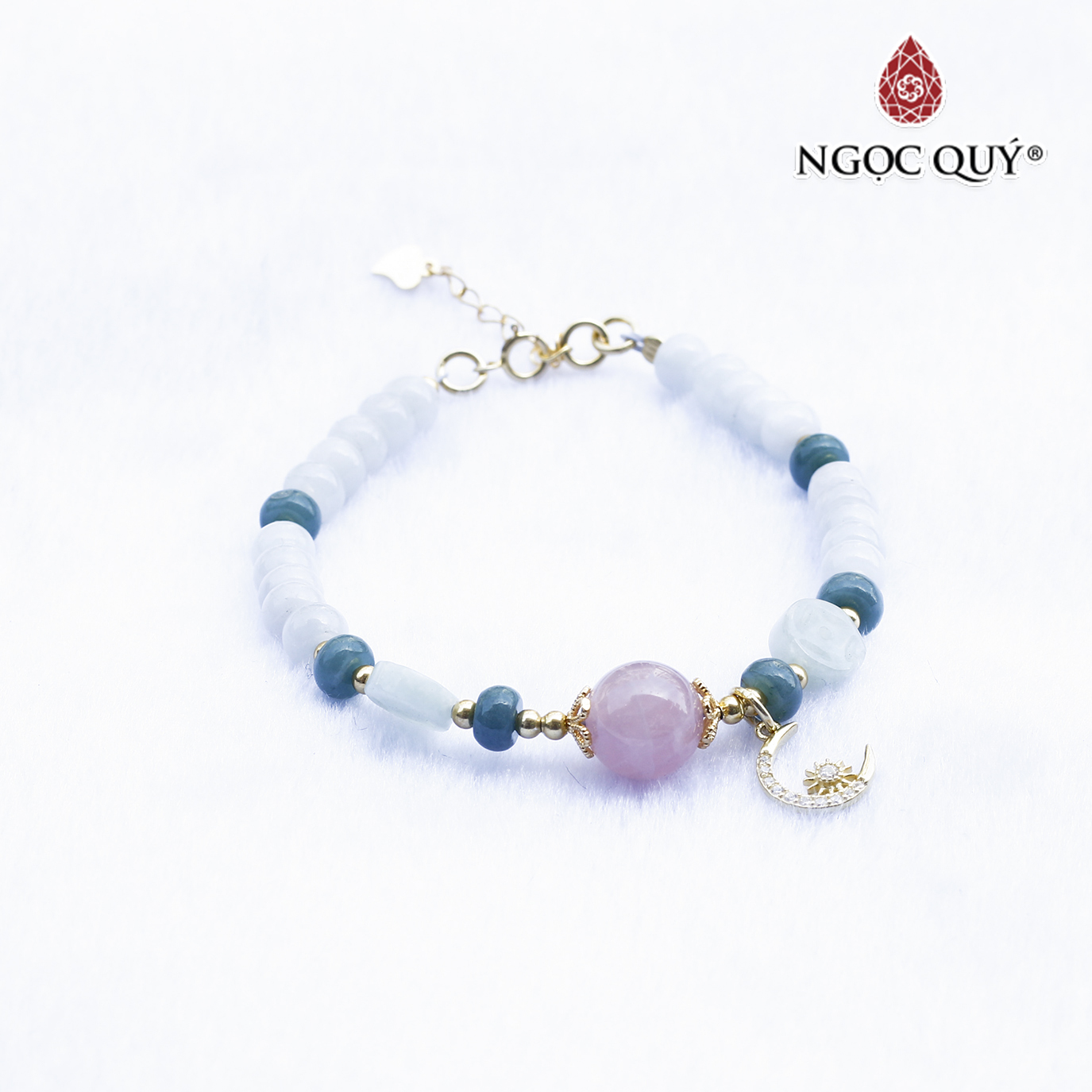 ✨Vòng cẩm thạch phỉ thúy phối thạch anh hồng charm bạc mạ vàng - Ngọc Quý Gemstones