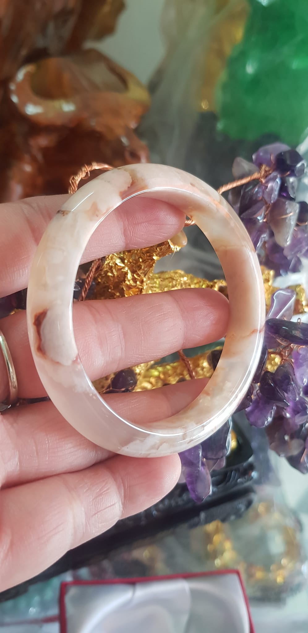 Vòng tay Nữ Bản Hẹ Mới Đá Mã Não Bông Tuyết Hồng nhẹ trắng trong bóng quá đẹp luôn ạ Ni 53mm x Cao 11mm x dầy 7mm Nữ Cân nặng 52kg - 55kg đeo