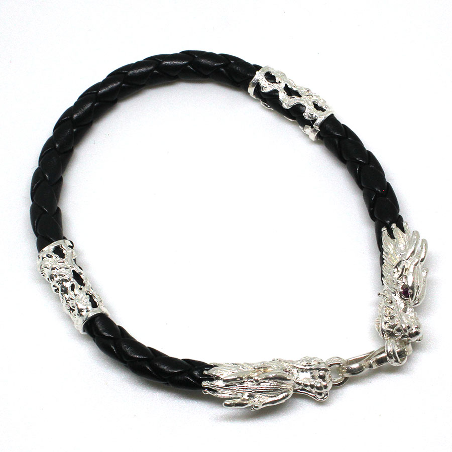 Vòng tay, lắc tay nam da thật bọc đầu rồng bạc ta 925 nam tính chính hãng trang sức BẠC HIỂU MINH LTN003T