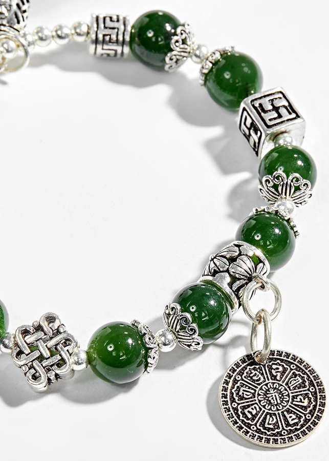 Vòng tay ngọc bích phối charm hoa sen (10mm) có tác dụng mang đến vận may, giúp người đeo tránh được những rủi ro, các thế lực tà ma và sự nguy hiểm.