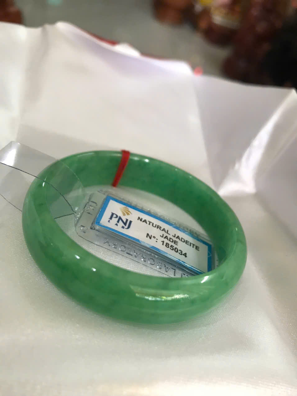 Vòng Tay Nữ Đá Ngọc Cẩm Thạch Tự Nhiên Bản Hẹ Sịn Đậu Lý Sao Ni 48mm Cao 12mm Dầy 6mm đã kiểm định kèm giấy chứng nhận P No 185034 Màu Xanh ngọc lý tươi bóng đều đẹp nữ tay nhỏ 35kg - 48kg ạ