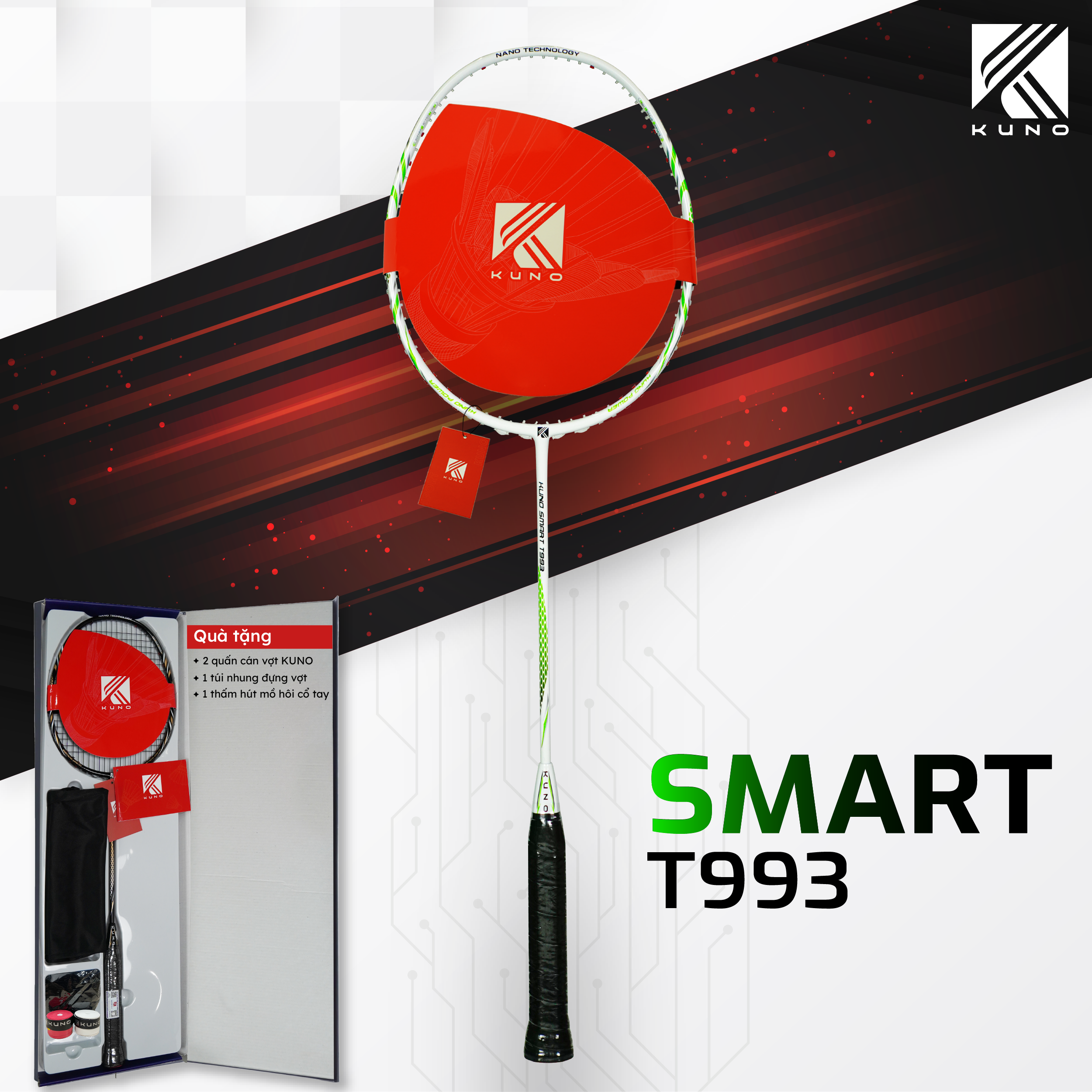 Thông Tin Sản Phẩm Vợt Cầu Lông KUNO Smart T993: -Chất liệu vợt: High Modulus Graphite: công nghệ này cung cấp độ cứng và sức mạnh cao, giúp tăng cường hiệu suất đánh và tốc