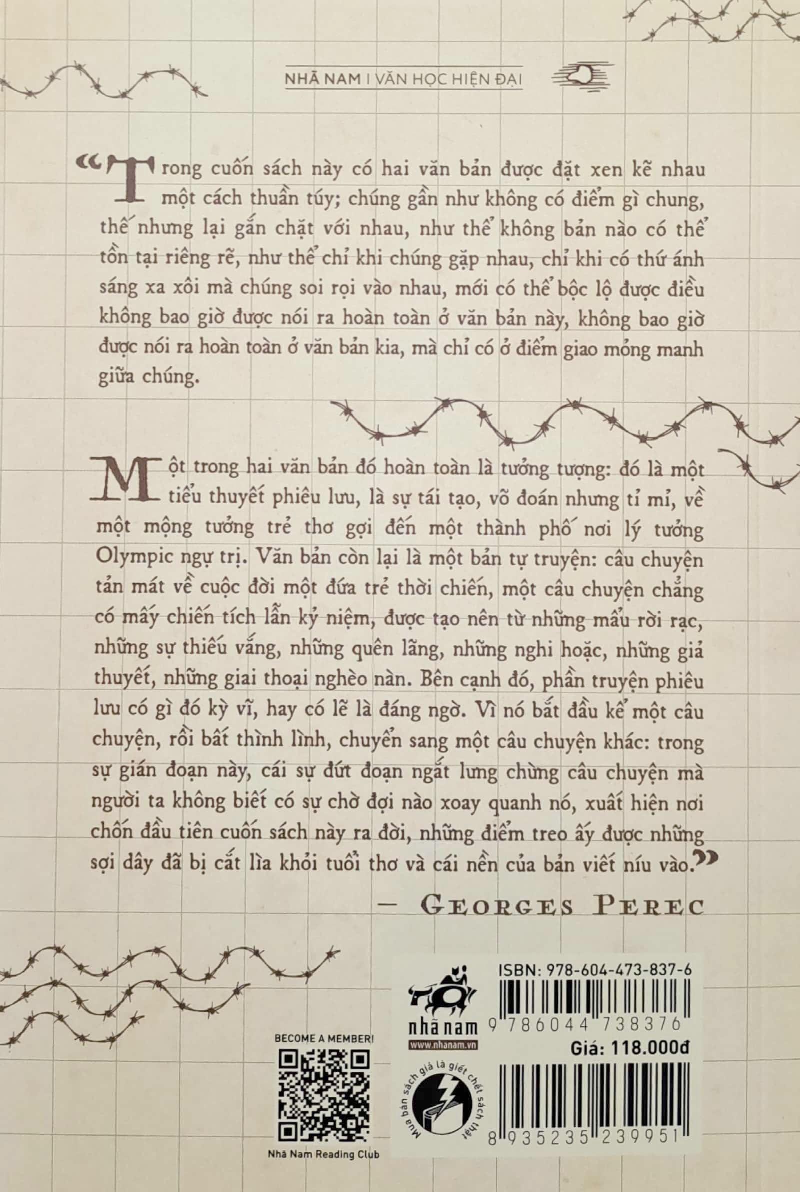 CUỐN SÁCH NÀY NHƯ MỘT CUỐN TỰ TRUYỆN, THỂ HIỆN BÚT PHÁP VÔ CÙNG ẤN TƯỢNG VÀ TÀI NĂNG CỦA GEORGES PEREC, MỘT NHÀ VĂN TÀI HOA NHƯNG YỂU MỆNH CỦA NỀN VĂN HỌC PHÁP!