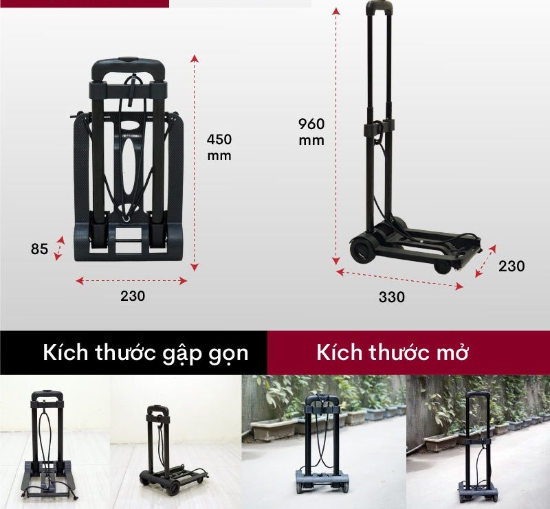 Xe được sử dụng để chở hàng hóa, chở thùng hộp có kích thước nhỏ gọn và nhẹ Kiểu xe: gấp gọn thuận tiện mang theo hoặc để trong ô tô, chung cư, gia đình