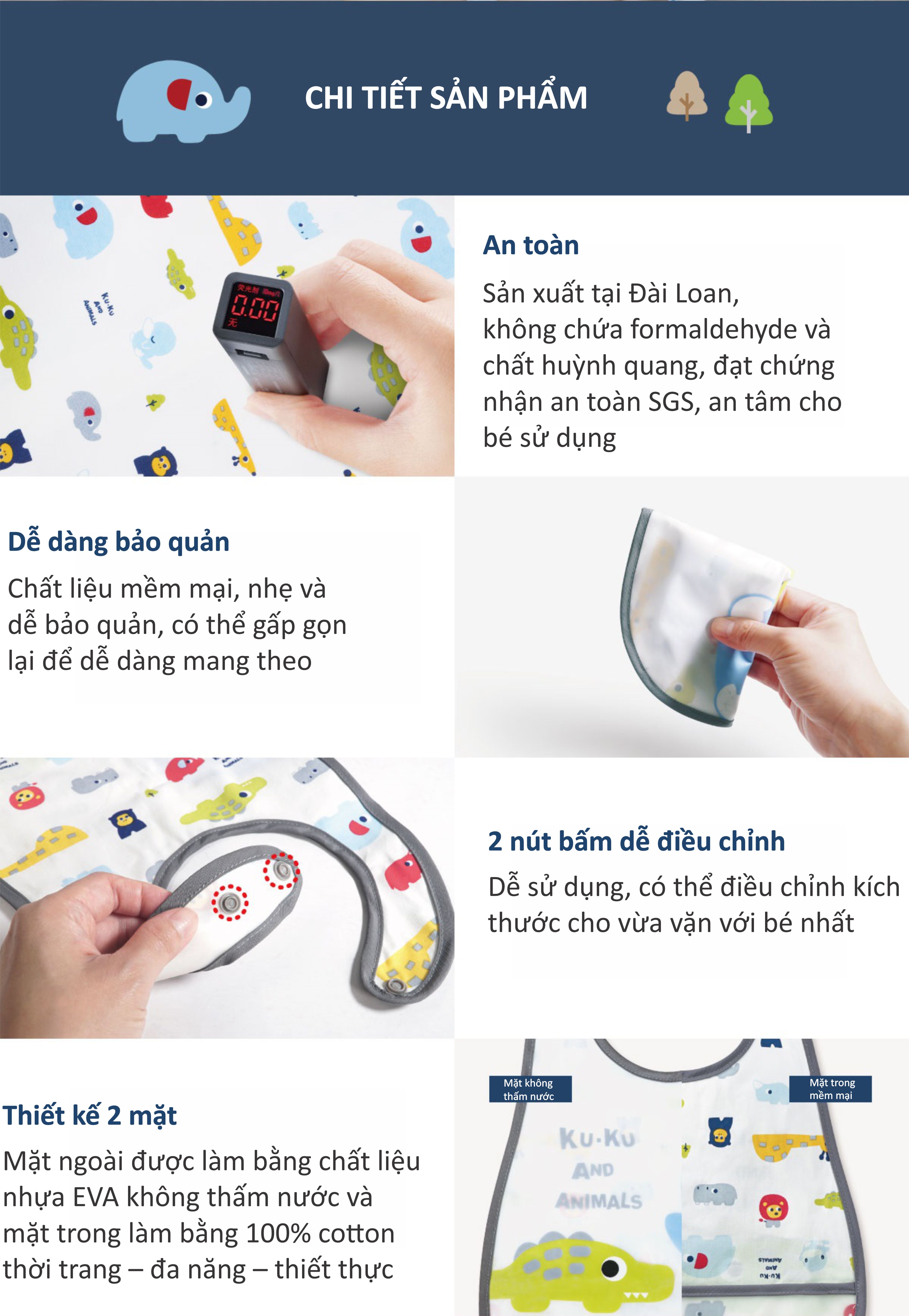 Yếm Cho Bé Bằng Vải KuKu KU2235 được thiết kế gài với nút bấm cố định chắc chắn vào người bé, cho con thoải mái ăn uống mà không sợ lẩm bẩn thức ăn. Yếm KU2235 được cắt may