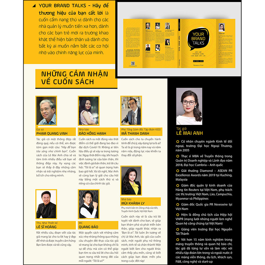 Đã bao giờ bạn tự hỏi “Tôi là ai” trong cuộc đời này? Bạn biết gì về thương hiệu cá nhân? Và làm cách nào để xây dựng thương hiệu cá nhân một cách hiệu quả? Thương hiệu cá nhân là một công cụ truyền thông độc đáo, cá tính và riêng biệt vì nó sẽ gửi đi một thông điệp nhất quán về việc bạn là ai và bạn có thể làm gì. Một thương hiệu cá nhân mạnh và chất sẽ giúp bạn trở nên khác biệt với tất cả mọi người, và có thể xác định vị trí của bạn như một chuyên gia trong ngành. Tác giả Lê Mai Anh, là Thạc sĩ MBA về Truyền thông trong Quản trị Doanh nghiệp & Lãnh đạo năm 2018, Đại học Cumbria – Anh quốc; từng đoạt giải thưởng Diamond – ASEAN PR Excellence Awards năm 2019; hiện là Giám đốc quản lý kinh doanh của Hãng tin Reuters và Giám đốc Quốc gia PR Newswire tại Việt Nam. Với hơn 15 năm kinh nghiệm trong mảng truyền thông và quan hệ báo chí, Tác giả sẽ từng bước giúp bạn nhận thức rõ giá trị cốt lõi của bản thân, từ đó biết cách thể hiện tốt nhất ưu điểm của mình. Bắt đầu từ việc nhận diện thế mạnh tới phát huy chúng và nhận được đánh giá tích cực từ mọi người xung quanh – mỗi trang sách đều đầy ắp những thông điệp tích cực và những lời hướng dẫn chân thành.